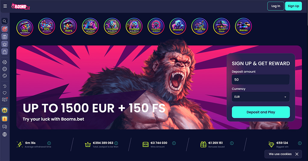 Booms.bet is een snelgroeiend no-account casino dat uitblinkt in gebruiksvriendelijkheid en betrouwbaarheid. Het platform biedt royale bonussen, bliksemsnelle uitbetalingen en een uitstekende spelervaring op desktop en mobiel. Een topkeuze voor spelers die direct willen spelen zonder gedoe.