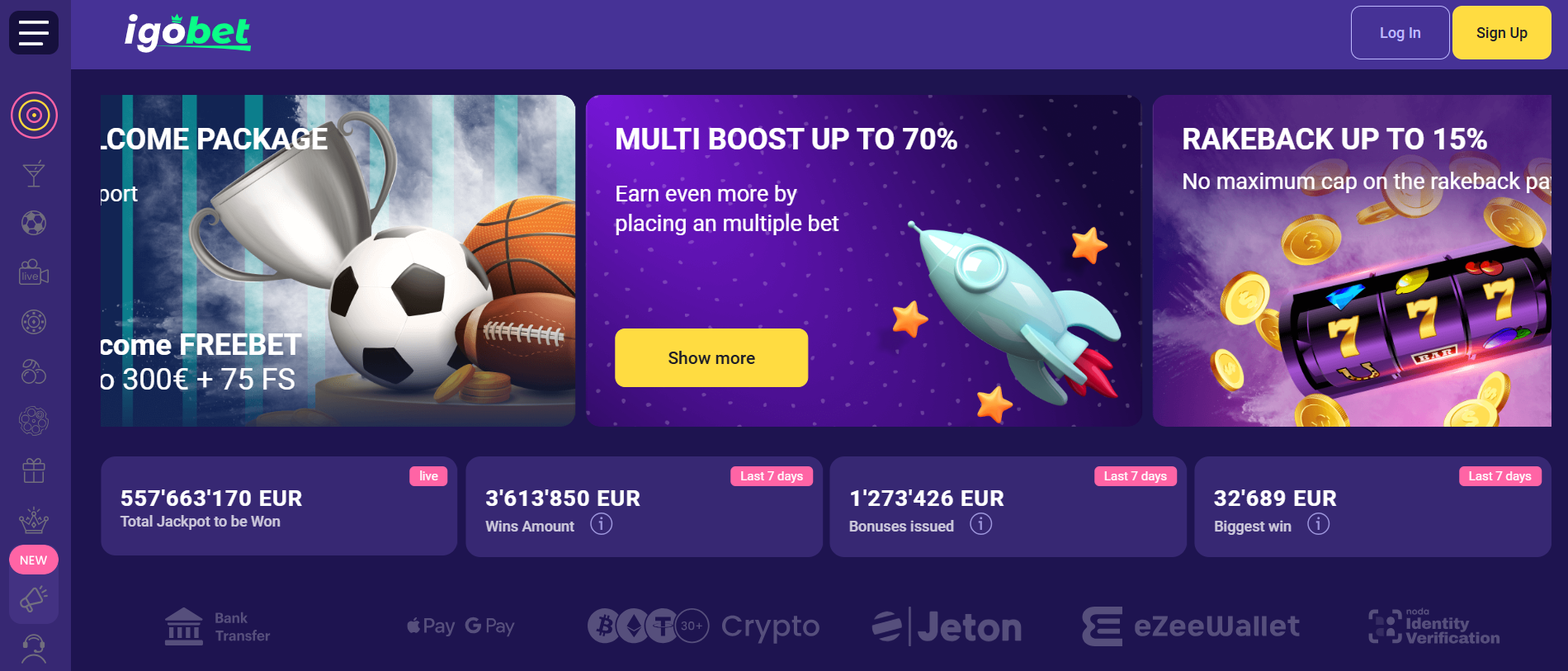 igo.bet is een modern platform dat de nadruk legt op eenvoud en snelheid. Dankzij de Pay N Play-functie kun je zonder traditionele aanmelding direct geld storten via je bank en beginnen met spelen. De website is strak ontworpen en perfect geoptimaliseerd voor mobiel gebruik.